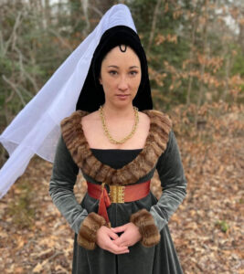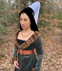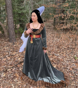 A client has crafted a stunning 1470s-80s Burgundian outfit, featuring an exquisite Mulberry Red Silk Damask texture for her belt. It undoubtedly adds a touch of timeless elegance, and the overall result is truly fabulous!