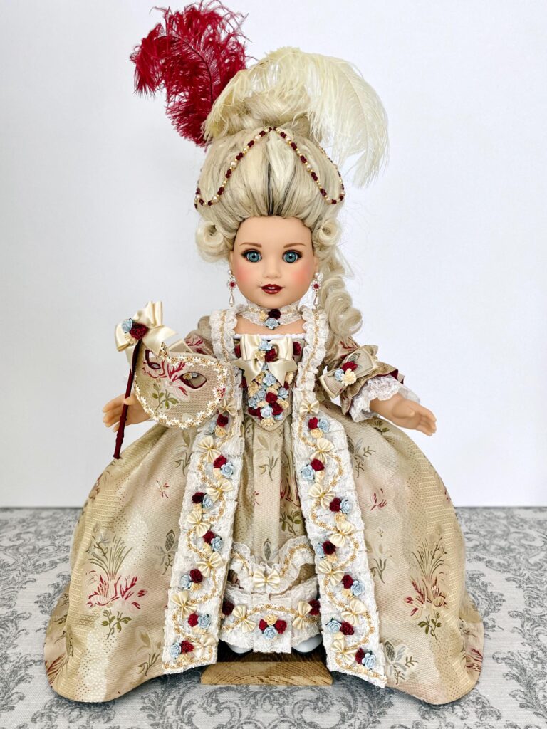 An elegant masterpiece handcrafted from luxurious 100% silk Lampas Garden Trail fabric, this French-inspired gown is adorned with exquisite creamy gold French lace. The intricate detailing, complemented by rich floral patterns, captures the opulence of vintage European fashion. A timeless statement of grace and sophistication, designed to make any occasion unforgettable.