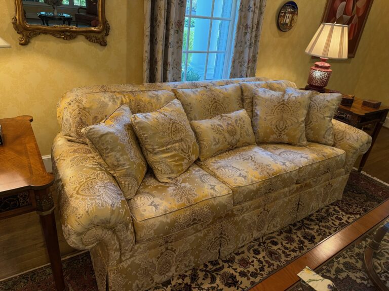 This handcrafted sofa, upholstered in Scalamandre Teodora Ochre Gold Old World Weavers Silk Damask,…