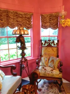 The beautiful iridescence of Scalamandre’s Opalino Flame is artfully demonstrated in these Austrian Shades.